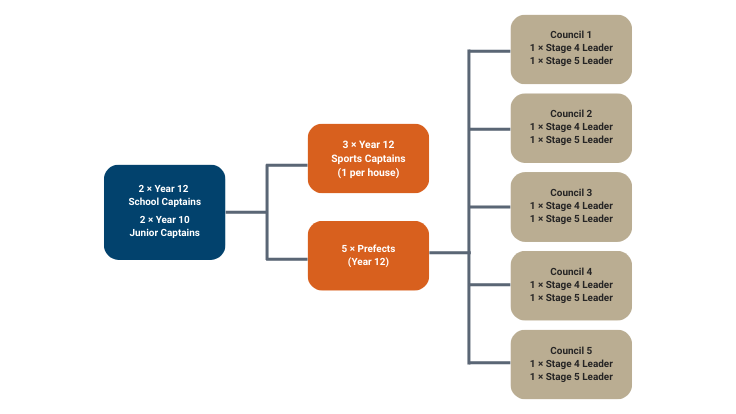 This model ensures students have opportunities to lead through both formal roles and council representation, helping them develop the skills, confidence and responsibility to make a positive contribution to their school and community.